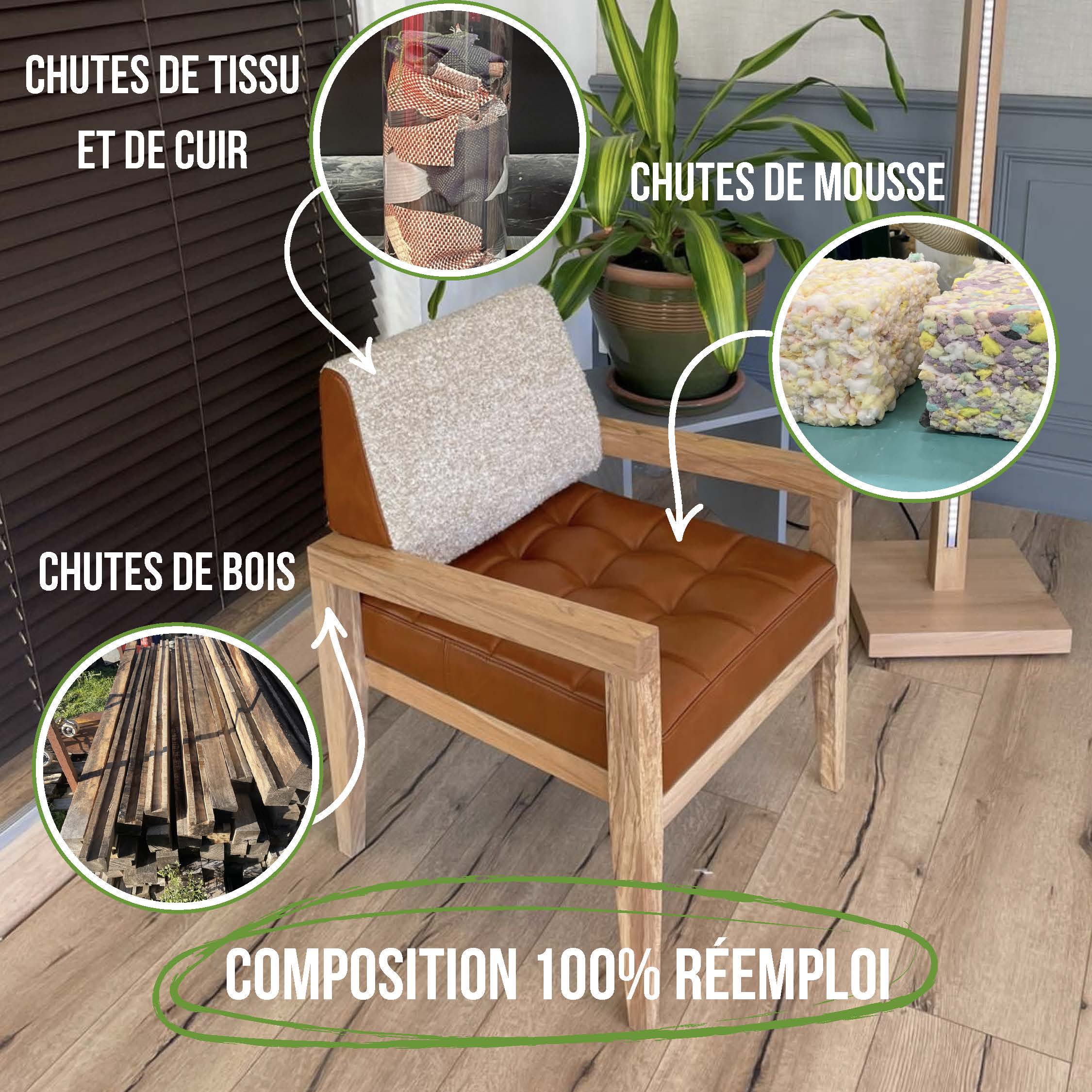 La collection de mobilier d’intérieur est dessinée par deux artisans : Richard et Jacob (La Regratterie) pour la menuiserie et Stéphan (Stéphan Hamache) pour la tapisserie d’art. Composition : 100 % réemploi avec un maximum de matières locales